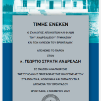 • Επίδοση αναμνηστικής πλακέτας στον κ. Γεώργιο Ανδρεάδη για τη συνολική προσφορά της οικογένειάς του στα πολιτικά, κοινωνικά και εκπαιδευτικά δρώμενα του Βροντάδου.