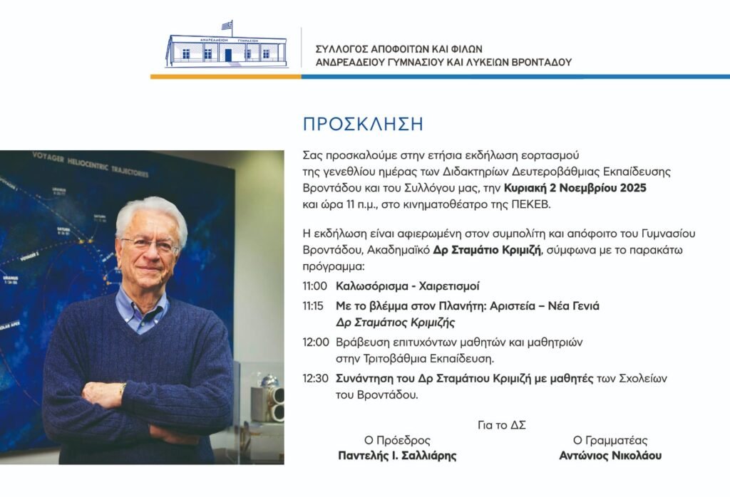 Ο Δρ. Σταμάτης Κριμιζής γεννήθηκε στον Βροντάδο της Χίου το 1938 και αποφοίτησε από το τοπικό Γυμνάσιο Αρρένων το 1956. Καθώς ο πατέρας του ήταν μετανάστης που συχνά ταξίδευε από και προς τις Ηνωμένες Πολιτείες της Αμερικής, ο Δρ. Σταμάτιος Κριμιζής φοίτησε στα Πανεπιστήμια της Μινεσότα (Πτυχίο Φυσικής, 1961) και της Αϊόβα (μεταπτυχιακή εξειδίκευση M.Sc. 1963, διδακτορική διατριβή 1965) των ΗΠΑ. Εργάστηκε ως καθηγητής της Σχολής Φυσικής και Αστρονομίας του Πανεπιστημίου της Αιόβα και το 1968 ανέλαβε την ηγεσία της Ομάδας Διαστημικής Φυσικής και Διαστημικών Οργάνων στο Εργαστήριο Εφαρμοσμένης Φυσικής (Applied Physics Laboratory) του Πανεπιστημίου Johns Hopkins. Είναι μέλος της Ακαδημίας Αθηνών.